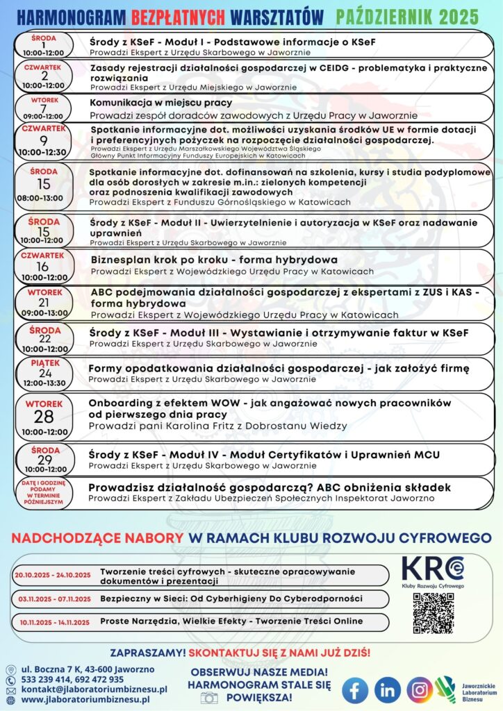 Zastanawiasz się, jak rozwinąć swój biznes, założyć firmę, a może wciąż szukasz pomysłu na siebie? Powiatowy Urząd Pracy w Jaworznie zaprasza na bezpłatne warsztaty do Jaworznickiego Laboratorium Biznesu! Oferujemy praktyczną wiedzę, indywidualne konsultacje z ekspertami i inspirację, która pomoże Ci obrać właściwy kierunek.