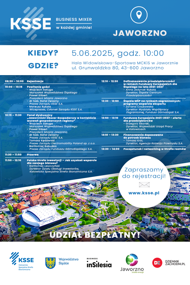 Katowicka Specjalna Strefa Ekonomiczna (KSSE) zaprasza na kolejną edycję Business Mixera – tym razem w Jaworznie! Już 5 czerwca 2025 roku o godzinie 10:00 spotykamy się w Hali Widowiskowo-Sportowej MCKiS przy ul. Grunwaldzkiej 80 w Jaworznie. Spotkanie będzie okazją do wymiany doświadczeń, nawiązania kontaktów biznesowych oraz zapoznania się z ofertą instytucji wspierających przedsiębiorczość w regionie.