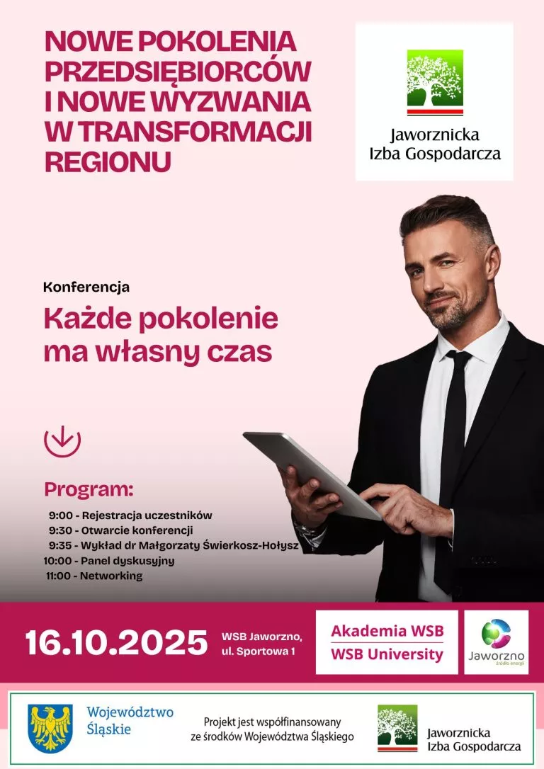Konferencja odbędzie się 16 października 2025 r. w Akademii WSB w Jaworznie (ul. Sportowa 1). Organizatorem wydarzenia jest Jaworznicka Izba Gospodarcza (JIG), która od lat wspiera lokalne firmy, pomagając im rozwijać działalność zarówno regionalnie, jak i na poziomie krajowym czy międzynarodowym.